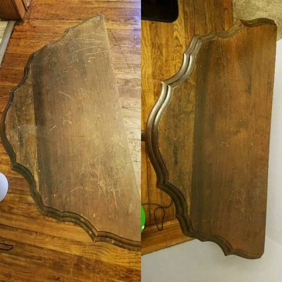 This product is nothing short of amazing. I wish I had taken more Before pix. I have some antiques and from moving 3 times in the last 4 years the movers managed to add more nicks and dings. And my dog used to jump up to check if there was food up there leaving scratches. My kids also have left glasses which made those water rings on the wood. I was seriously thinking how I was going to carve out time to stain this thing. Then I saw an article on BuzzFeed about this product.It did not disappoint. I have used the Almond Stick Furniture Eraser which made the scratches fade but came right back up again. This product does not do that. It goes on smooth. A little goes a long way. I applied it to a piece of an old flannel sheet I cut up (for staining and art stuff) and rubbed it on the scratches. It immediately worked. The wood looked rich and like new. I ended up doing the whole piece. I wish I had taken more before photos but I was so excited it was working so easily I just kept covering the piece. I have attached a few.