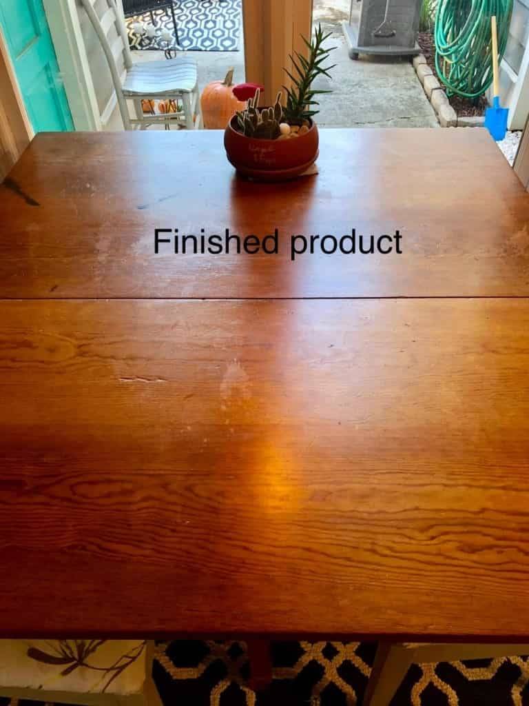 I bought this after seeing it featured in a Buzzfeed article and reading the reviews. My great-Grandfather built the table I use in my kitchen and it’s gotten pretty roughed up over the years. The product was easy to apply, then I left it on for 20 minutes before wiping away any residue. It does have a strong scent, so I kept the windows open for a bit. It definitely improves the appearance. It did not completely erase the water rings, but it dramatically minimized them. It’s not a miracle worker- the table still ultimately needs to be sanded down and refinished, but short-term, this is a huge improvement. The finish isn’t sticky or oily at all and the smell dissipates quickly. I would recommend it definitely over other polishes I’ve tried.