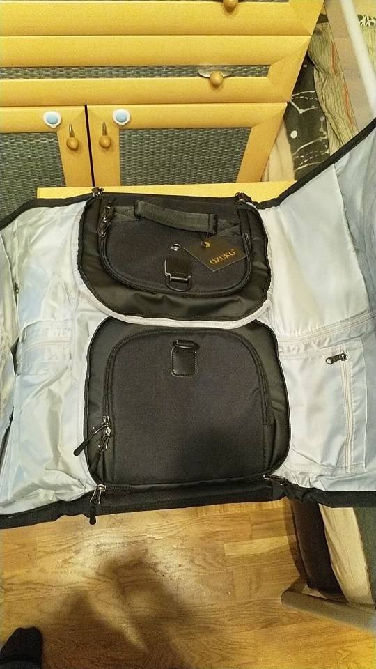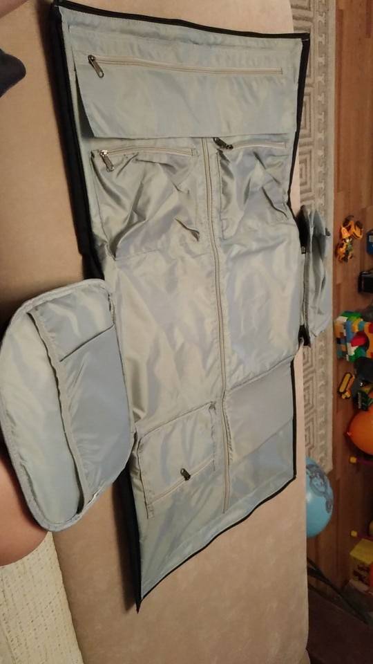 Bag chic! Handles on the back can be hidden and worn as a bag, not a backpack. I really liked the pocket for the costume/dress, from below there are clips, as well as along the entire length there are two belts in order that the costume or dress is not wrinkled and not rolled in your pocket. Small pockets throughout the bag are very much, there are also for shoes. The material is dense and clearly will not get wet from the rain immediately. Sent in a branded package, with all the tags. A man's bracelet was sent as a gift. I am very happy with the purchase, I recommend the product and the store!!