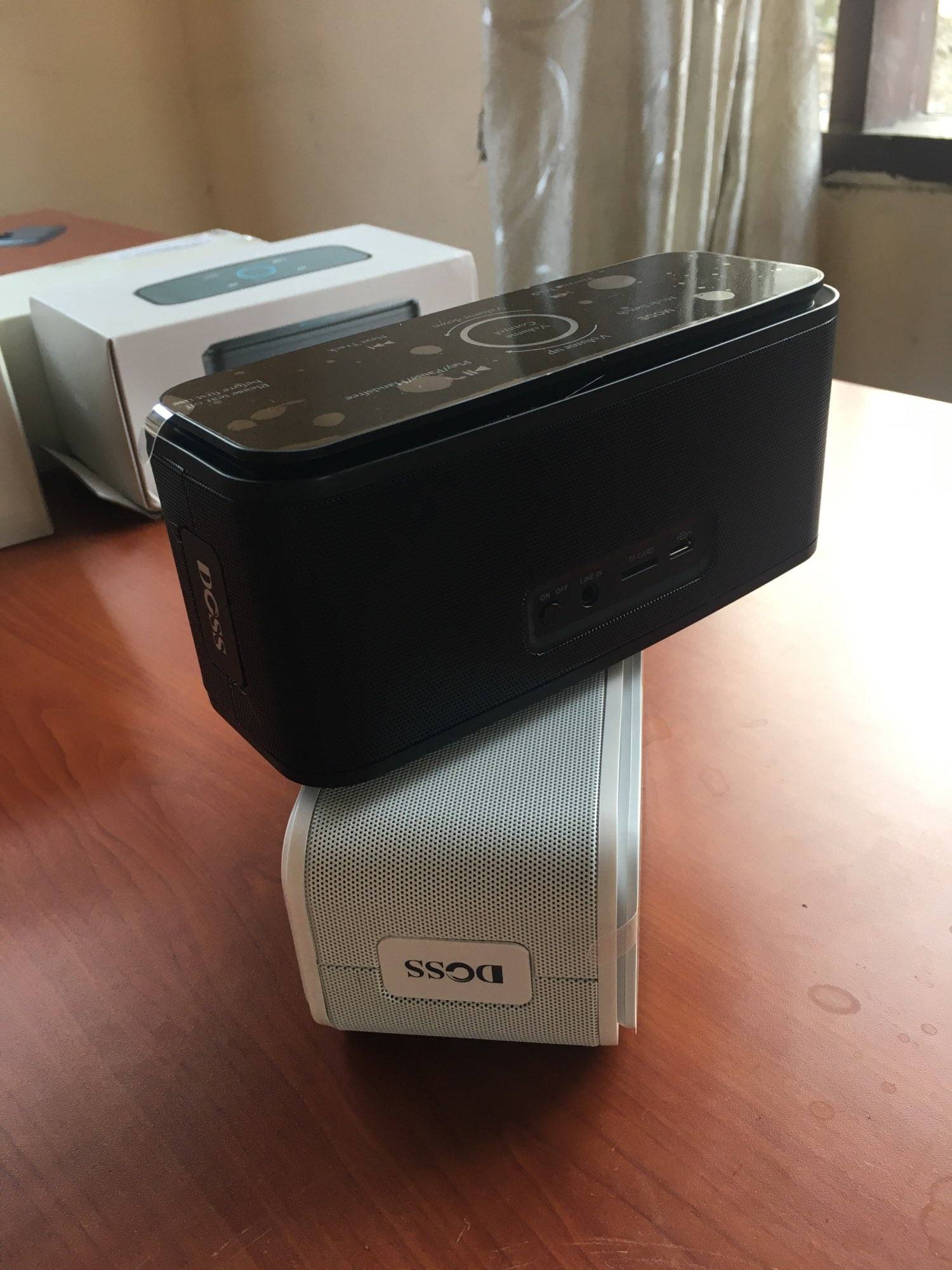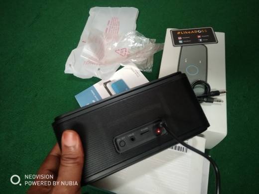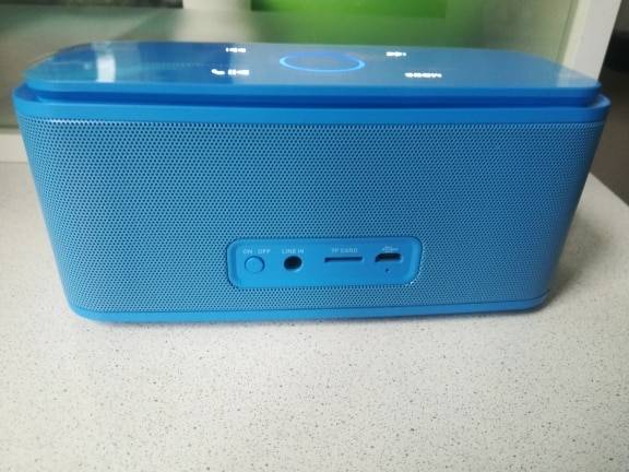 Actually, it has an amazing clear sound compared to the same series and size. I like touchable volume control. LED screen is amazing with different colors indicating SD card or bluetooth. really I like its design and it helps everywhere. Thanks DOSS for the powerful batteries.