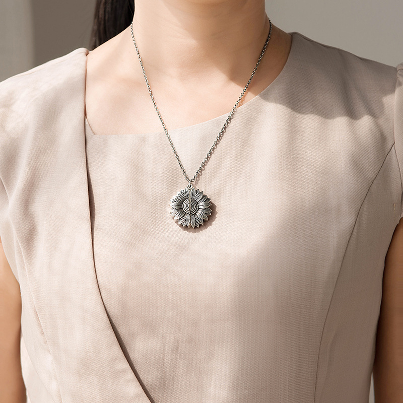 The sunflower locket opens up to reveal the loving words “You Are My Sunshine”